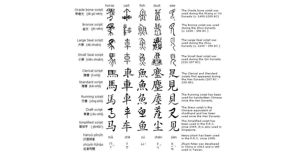 | نقوش العظام (Oracle Bone Script) | 甲骨文 (Jiǎgǔwén) | عهد شانغ (حوالي 1600-1046 ق.م) | تصويرية جدًا، نقوش على عظام وسلاحف قسم الكيمياء وعلم المواد+2المتحف الوطني للفن الآسيوي+2 |